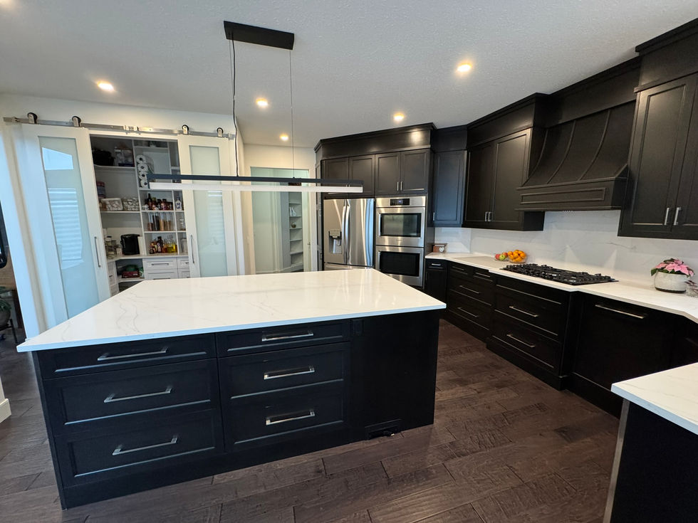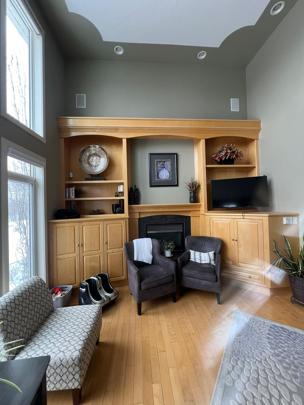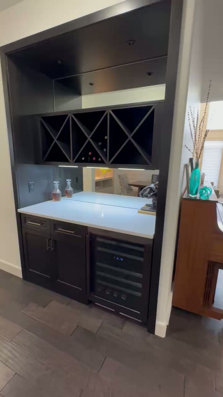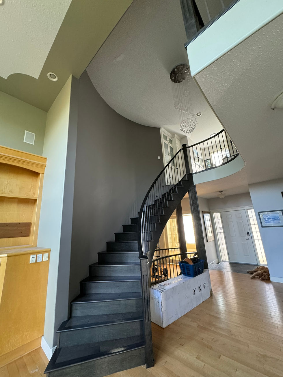 See how we transformed this main level from outdated 2000's to magazine worthy modern. These clients had a specific vision in mind with this large ceiling and we were able to make it come to life. We utilized the over sized ceiling to our advantage by incorporating a halo affect with led strips, a perfect touch to create a relaxing living room setting for relaxation time with family. We added some wainscoting to the curved staircase to add some style and make the area seem more grand when accompanied with the massive chandelier. In the kitchen they wanted to darken up the cabinets with an espresso color maple to make the new quarts countertops and light colored walls pop. We were able to achieve this look by saving the cabinet structures and just replacing the doors and panels.