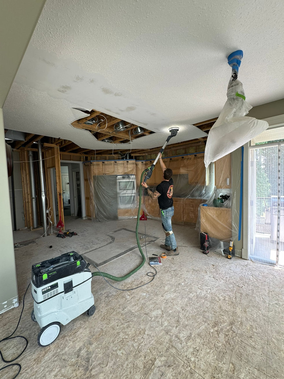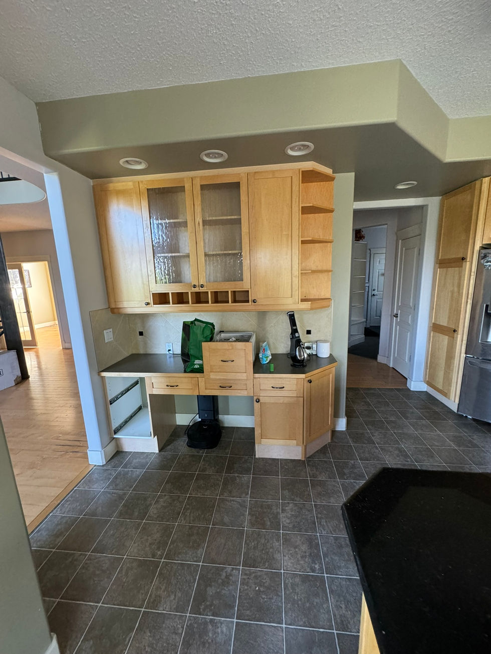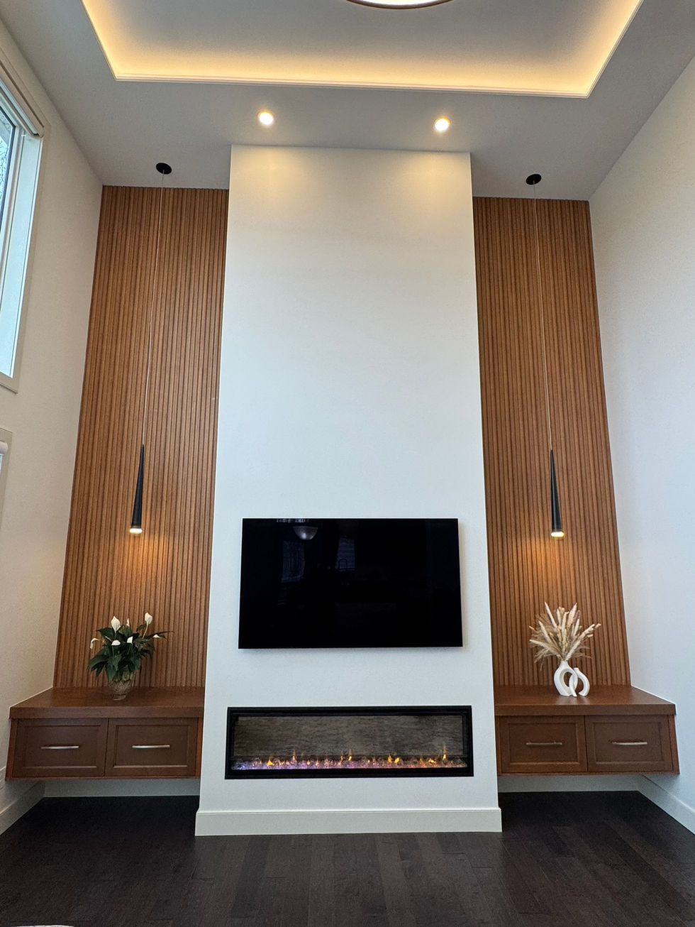 See how we transformed this main level from outdated 2000's to magazine worthy modern. These clients had a specific vision in mind with this large ceiling and we were able to make it come to life. We utilized the over sized ceiling to our advantage by incorporating a halo affect with led strips, a perfect touch to create a relaxing living room setting for relaxation time with family. We added some wainscoting to the curved staircase to add some style and make the area seem more grand when accompanied with the massive chandelier. In the kitchen they wanted to darken up the cabinets with an espresso color maple to make the new quarts countertops and light colored walls pop. We were able to achieve this look by saving the cabinet structures and just replacing the doors and panels.